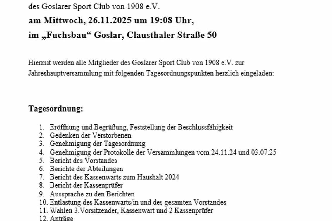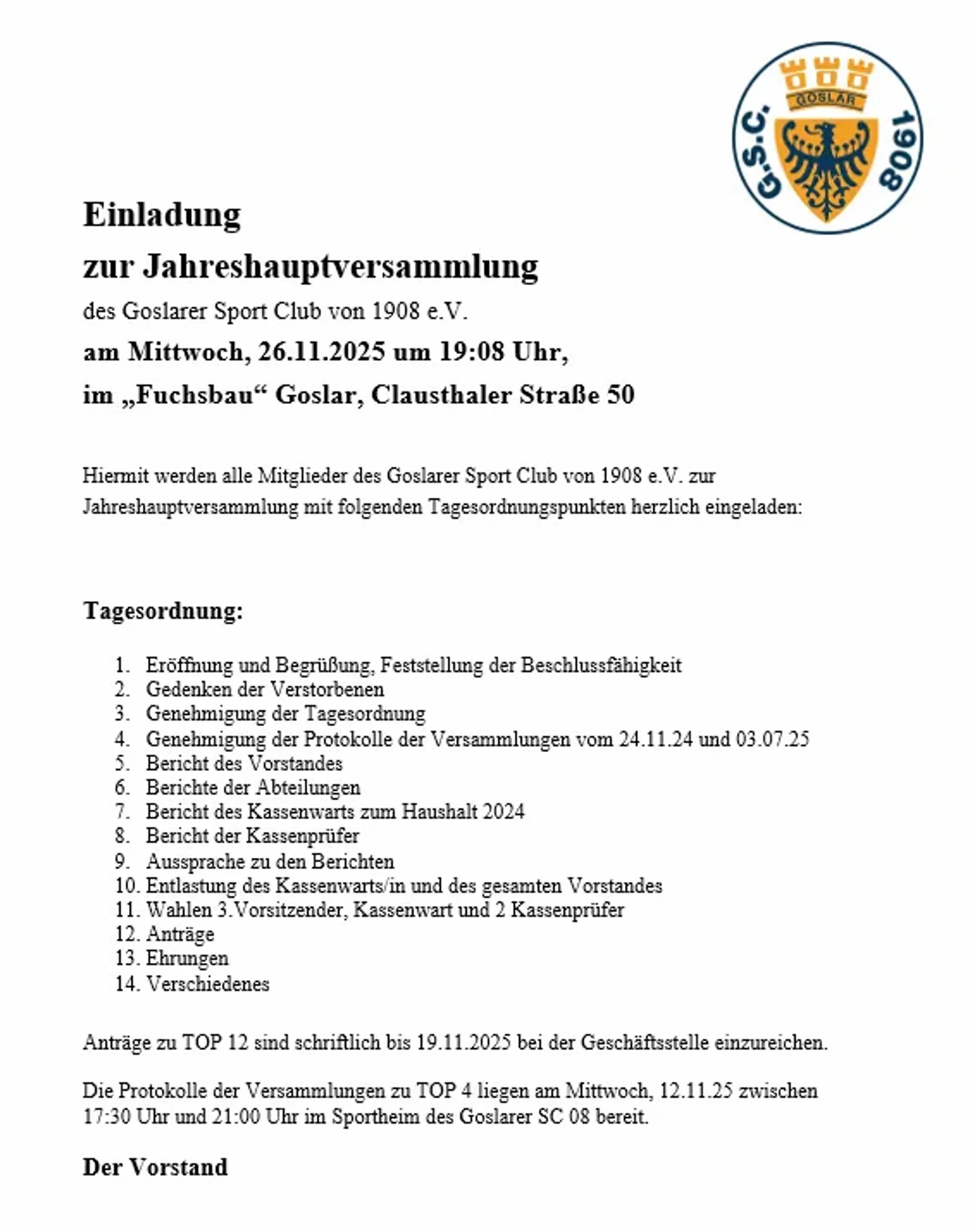 Am Mittwoch, dem 26.11.2025 lädt der Vorstand des Goslarer SC 08 seine Mitglieder zur alljährlichen Mitgliederversammlung in den "Fuchsbau" Goslar, Clausthaler Straße 50, ein.